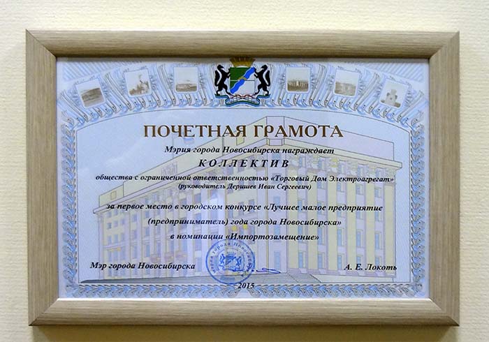 9 сентября 2015 г. состоялось подведение итогов конкурса «Лучшее малое предприятие (предприниматель) года города Новосибирска». ООО «Торговый Дом Электроагрегат» заняло первое место в номинации «Импортозамещение».